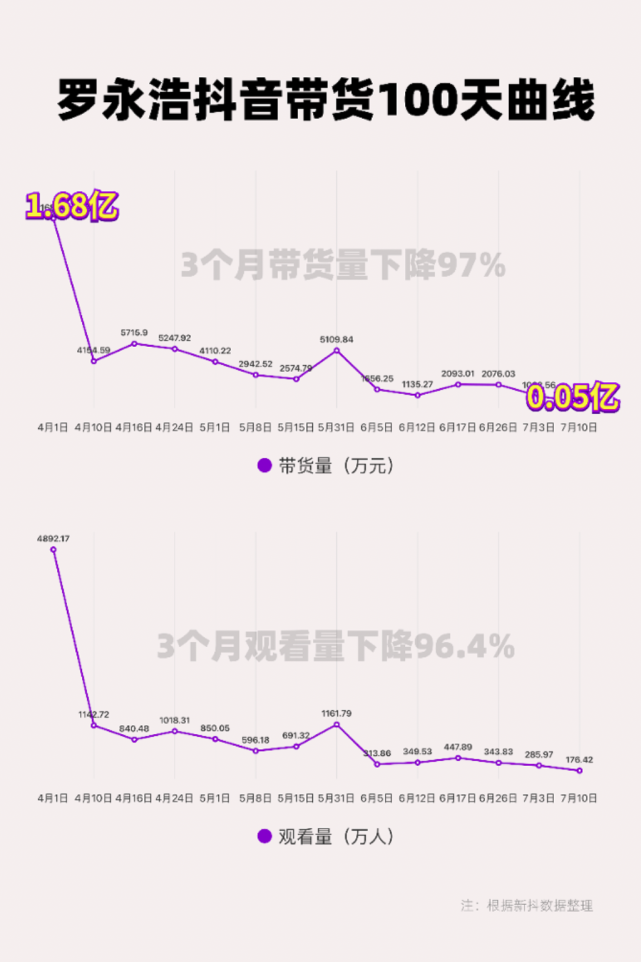 据Tech星球整理的新抖数据,罗永浩直播带货100天,带货量从峰值的1.68亿,一度下滑到了0.05亿;观看量则从最高的4892万,一度下滑到176万,跌幅堪称惨烈。