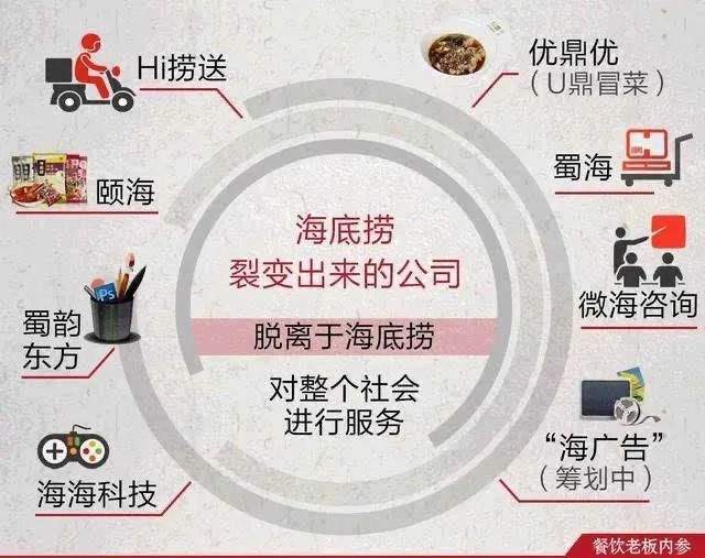 此外,还有负责羊肉采购的扎鲁特旗海底捞、负责开店装修的蜀韵东方、负责人力资源的微海咨询、提供财务咨询服务的海晟通、提供餐饮软件系统的红火台网络科技、负责火锅外送的海鸿达以及负责游戏开发的海海科技(打发等位时间)。他们的壮大和完善,也在成就着更大更强的海底捞。