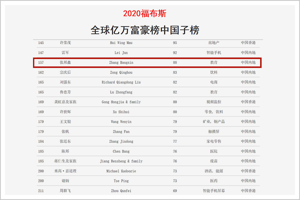 今年4月初的2020福布斯全球亿万富豪榜上,80后张邦鑫成了中国教育培训领域的第一大富豪。在其88亿美元身价前,刘强东、李彦宏、宗庆后、郭台铭都只能靠后站。