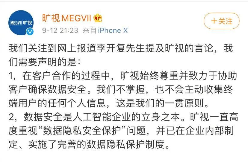 李开复也通过自己的微博发布声明,表示是自己口误,给三家公司带来困扰,深感歉意。称:“初期我曾经建议并帮助旷视团队寻找更多应用合作伙伴,以增强技术水平,提升模型识别率。合作中,旷视提供AI技术给到合作方,我理解数据一直存在合作方客户服务器中,不涉及任何数据的共享与传输”。