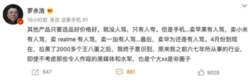 据罗永浩自己表述,4月份到现在,拉黑了2000多个人,自己终于意识到,原来之前六七年所从事的行业,即使不考虑那些令人作呕的黑媒体和水军,也是个大xx是非圈子。