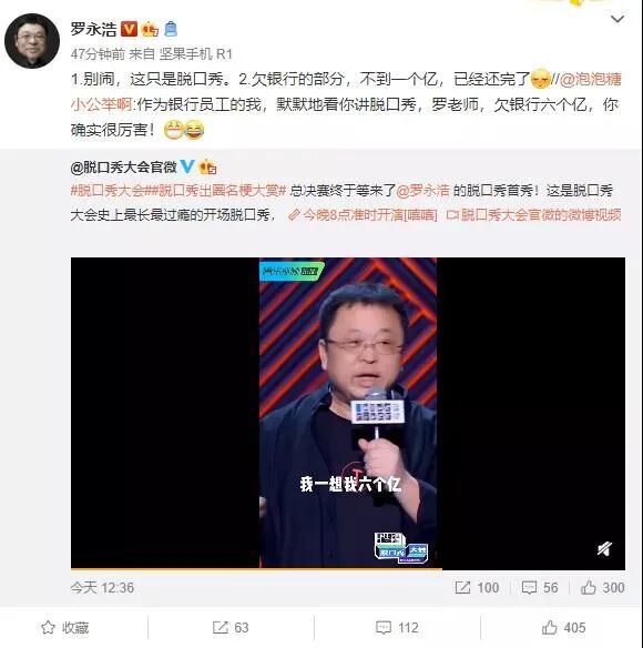从直播带货到脱口秀,罗永浩的主要目的只有一个:还钱。今晚,老罗本人亲口表态,欠银行的部分,不到一个亿,已经还完了。今日,脱口秀官微放出一段视频:“ 总决赛终于等来了@罗永浩 的脱口秀首秀!这是脱口秀大会史上最长最过瘾的开场脱口秀。”(快科技)