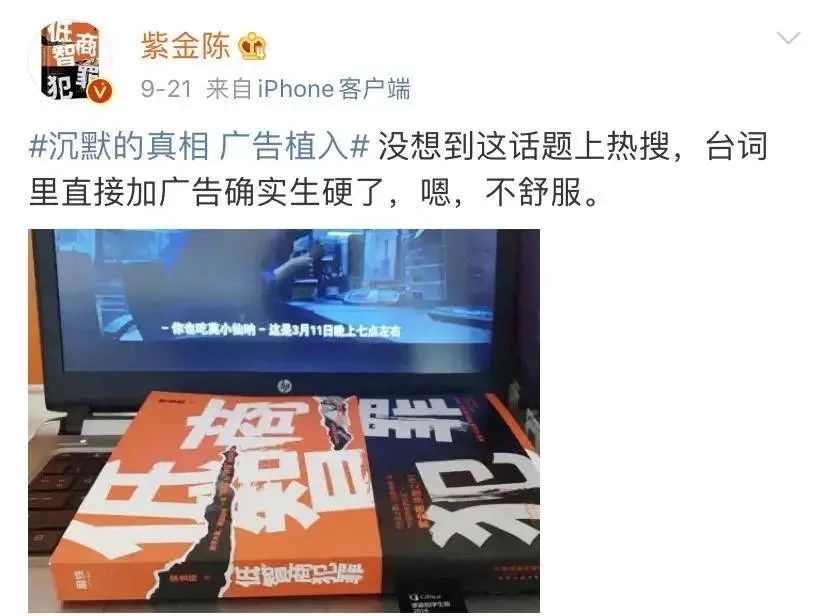 悬疑网剧《沉默的真相》口碑爆了,随之一起爆的,还有网友对该剧“中插广告”的吐槽。#沉默的真相 广告植入#话题从9月21日开始在微博热搜榜引爆,将一众品牌送上热搜,其中包括良品铺子。