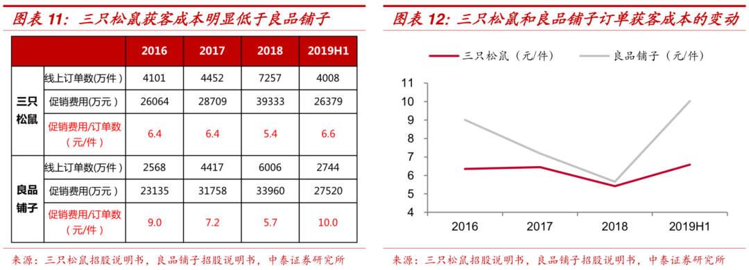 根据中泰证券研究所的调研,三只松鼠新客的获客成本约为30元,约为良品铺子的一半,2019年上半年,两者每笔订单所需促销费用分别为6.6元和10.0元。
