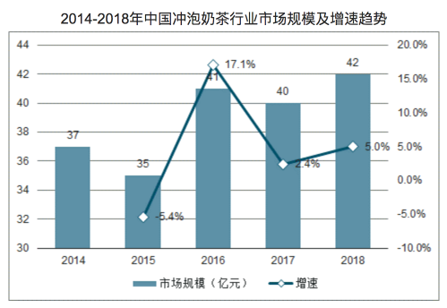 智研咨询数据显示,2015年中国冲泡奶茶市场规模已出现负增长;2016年有所复苏,增速达到17.1%;2017、2018年,增速再度下滑至个位数2.4%、5%。显然,冲泡奶茶市场已现天花板。