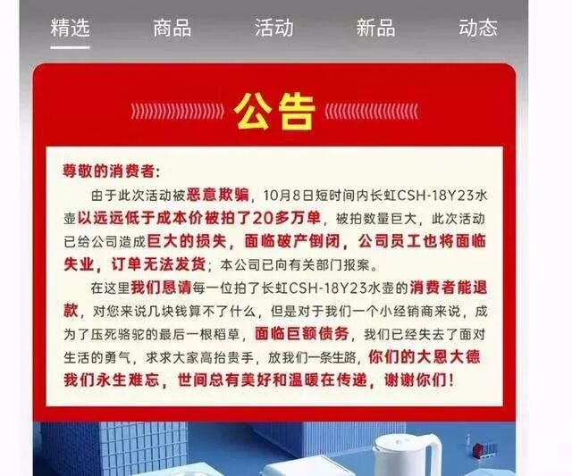 在京东“长虹厨房电器旗舰店”页面出现了这样一则告示:因被某推广机构恶意欺骗,10月8日短时间内长虹水壶以远远低于成本价被拍了20万单,给公司造成巨大损失,面临破产倒闭,公司员工也将面临失业,订单无法发货。该商家称,目前,公司已向有关部门报案。同时,商家在公告中也向已经拍下长虹这款水壶的消费者发出请求,希望消费者可以退款。