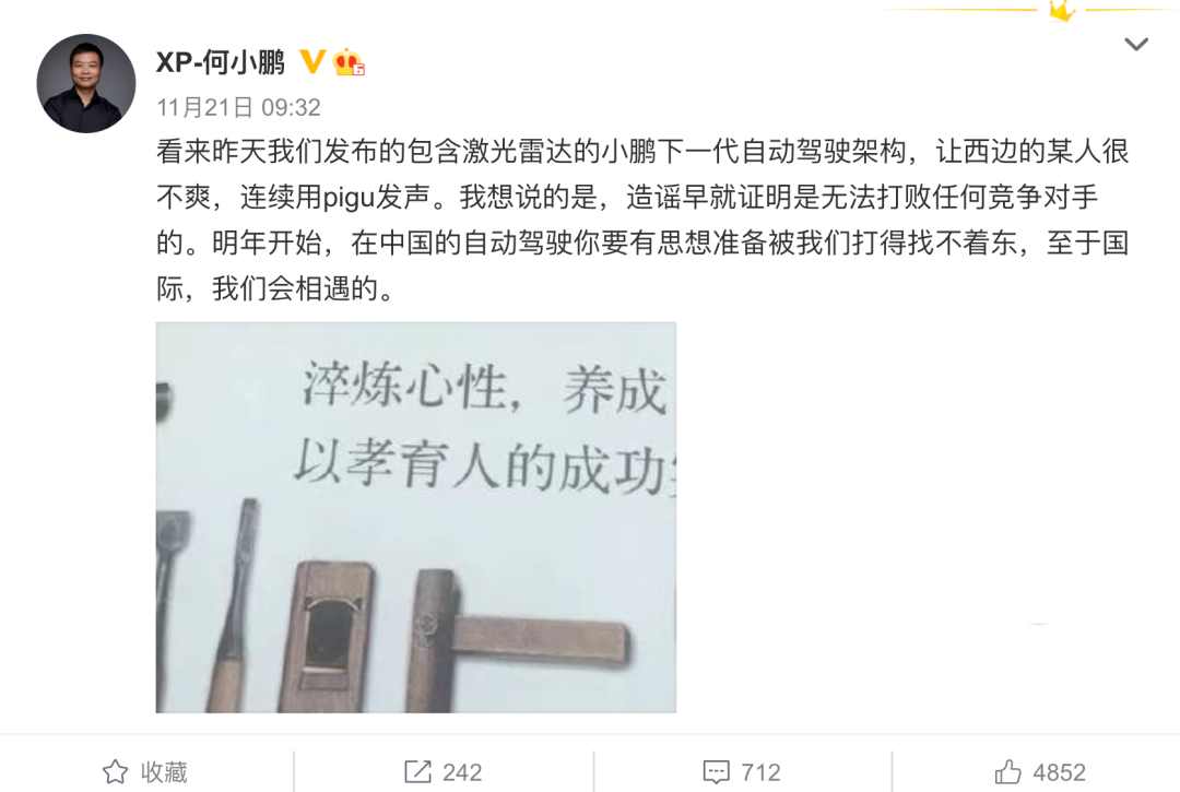 11 月 21 日,小鹏汽车董事长何小鹏疑似发微博回应:“ 看来昨天我们发布的包含激光雷达的小鹏下一代自动驾驶架构,让西边的某人很不爽,连续用 pigu 发声。我想说的是,造谣早就证明是无法打败任何竞争对手的。明年开始,在中国的自动驾驶你要有思想准备被我们打得找不着东,至于国际,我们会相遇的。”(Geek产品与未来)