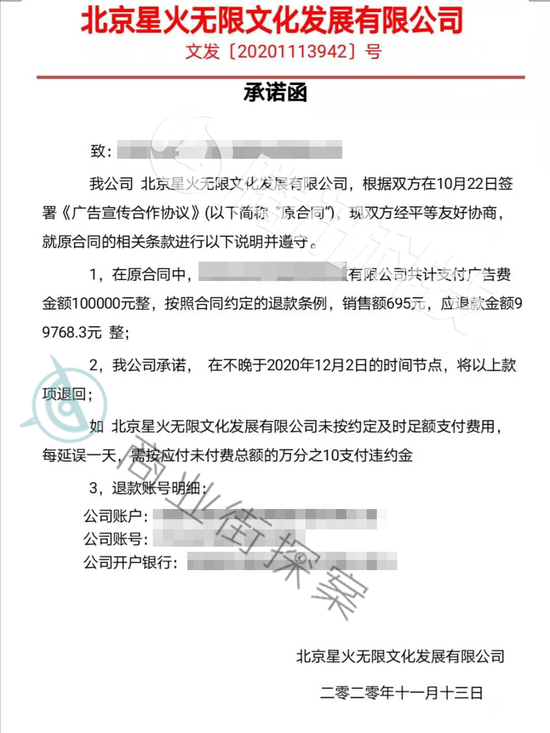 11月13日,星火无限给苏蓝发了一个承诺函,表示会在12月2日前退款。