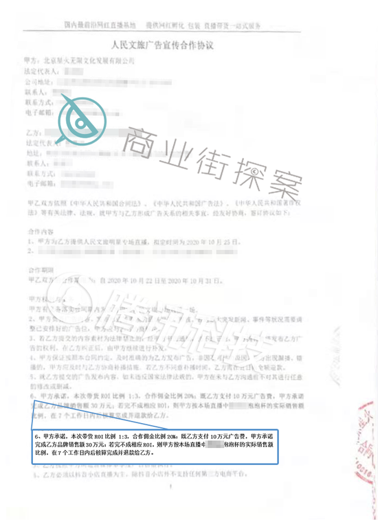 另外,苏蓝向【商业街探案】出示了一份合同,里面显示北京星火无限文化发展有限公司招商承诺带货ROI比为1比3,佣金20%,如果完不成销售额,按照实际销售额比例,在7个工作日内退款。