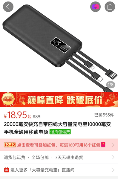 新浪科技在拼多多、淘宝等电商平台上看到,与共享充电宝企业的产品造型、功能类似的自带线充电宝,甚至卖出了一二十元的低价,远远低于正常充电宝产品的价格水平。对于低价背后的原因,多家店铺的客服都未有明确的答复。