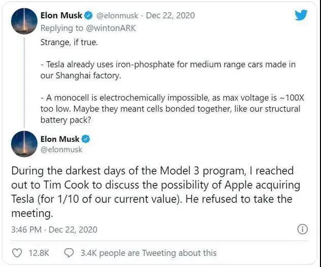 马斯克是在其个人推特上讨论苹果开始重新考虑制造和生产电动和自动驾驶车的话题时,透露该消息的。他指出,当时特斯拉的市值仅为现在的不到十分之一。在经历了2020年的股价暴涨后,特斯拉目前已经成为全球市值最大的汽车制造商。