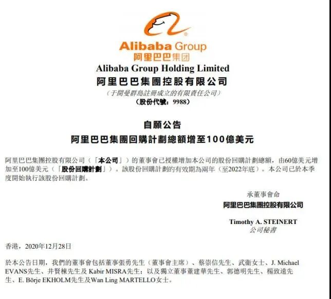 2.阿里回购加码至100亿美元 12月28日,阿里巴巴在港交所公告称,董事会已授权增加本公司的股份回购计划总额,由60亿美元增加至100亿美元。该股份回购计划的有效期为两年。浙江省市场监管局负责人日前在接受采访时表示,调查人员对阿里巴巴集团控股有限公司及部门相关负责人进行了调查询问,并提取相关证据资料。