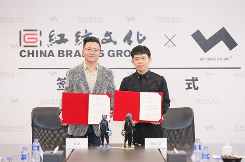 【红纺文化董事长郑波先生(左)和JT Studio创始人兼设计师曾弘杰(右)签约合影】