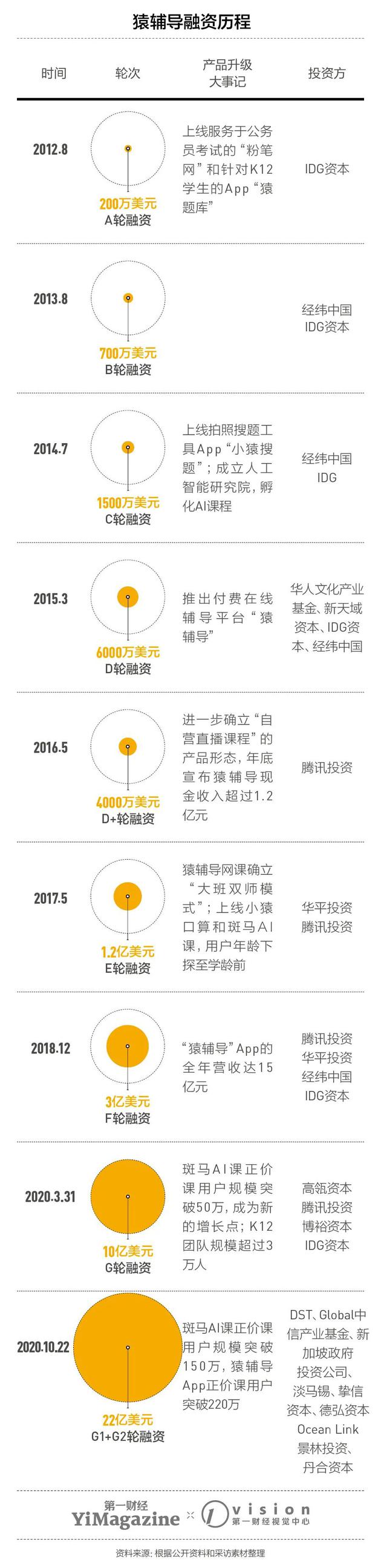 这家成立8年的创业公司在2020年因为屡获融资,轮次的表述已多到有点让人困惑——3月,猿辅导宣布完成10亿美元的G轮;10月,它又对外“补充”了两轮新融资,分别被命名为“G1”和“G2”轮,共计22亿美元。猿辅导目前最新的估值已经涨至155亿美元,成为国内教育技术领域“最贵”的独角兽公司。