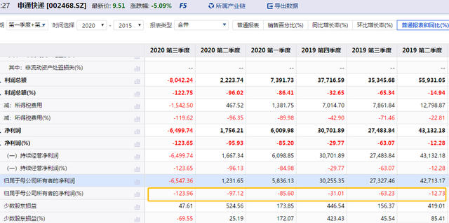 而申通的业绩也与市场对其的预期基本吻合。三季报显示,申通2020年第三季度营收54.53亿元,同比下降5.73%;归母净利润亏损6547.36万元,同比由盈转亏,下降123.96%。事实上,这已经公司连续六个季度业绩下滑。