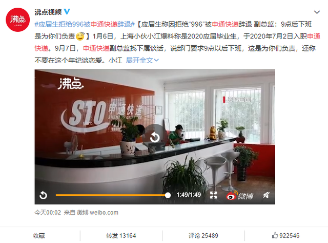 如今,微博话题#应届生拒绝996被申通快递辞退#阅读量数亿,几万名网友参与到讨论中。