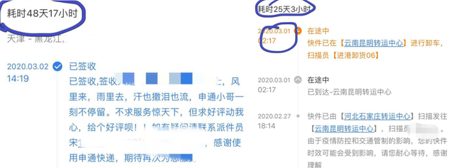更有知乎网友晒出了疫情期间申通快递的运送时间,其中显示,从河北寄到云南的快件耗时25天,而从天津寄到黑龙江的快件耗时则长达近49天。