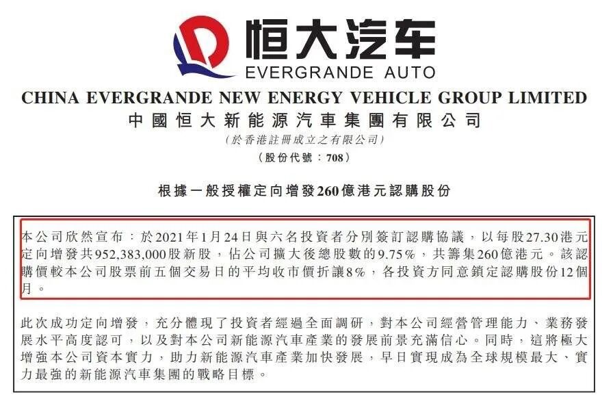 24日晚间,港股恒大汽车公告称,当日与六名投资者分别签订认购协议,以每股27.30港元定向增发共9.5亿股新股,占公司扩大后总股数的9.75%,共筹集260亿港元,该认购价较公司股票前五个交易日的平均收市价折让8%,各投资方同意锁定认购股份12个月。