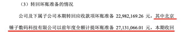 1月25日晚间,蓝思科技公告显示,锤子科技以前年度全额计提的坏账准备2713.11万元在2020年收回1134.63万元。