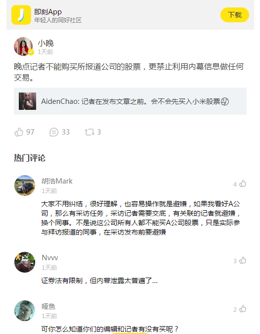 2月19日,针对“晚点LatePost”报道小米已确定造车事件,有网友留言称,记者在发布文章之前,会不会先买入小米股票?对此,晚点创始人小晚回复,晚点记者不能购买所报道公司的股票,更禁止利用内幕信息做任何交易。