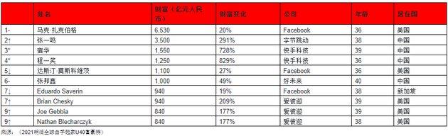 1.2021胡润全球白手起家40岁以下富豪榜:张一鸣排第二