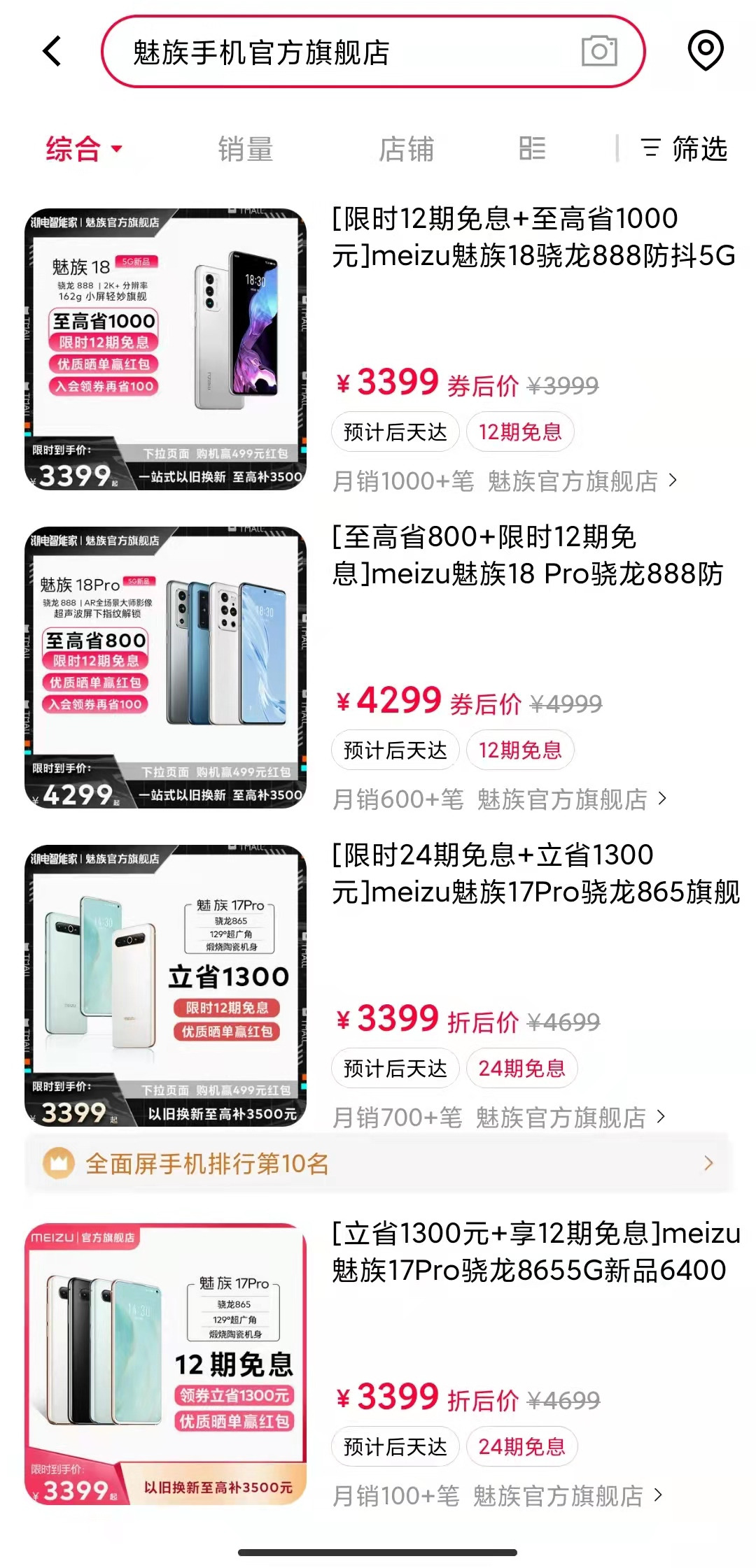 天猫上亦如此。魅族天猫官方旗舰店中,魅族18月销仅1000+笔,魅族18 pro 月销仅600+笔。