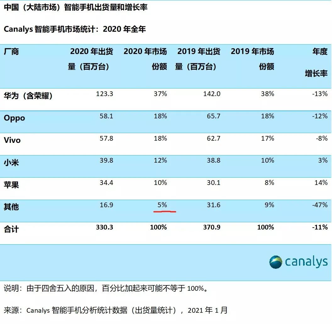 根据Canalys数据统计,2020年国内智能手机市场全年出货量3.3亿台,排在前五名的,分别是华为(含荣耀)、OPPO、vivo、小米、苹果。这五名全年拿走95%的市场份额,留给市场上其他所有厂商仅有约5%的市场份额。