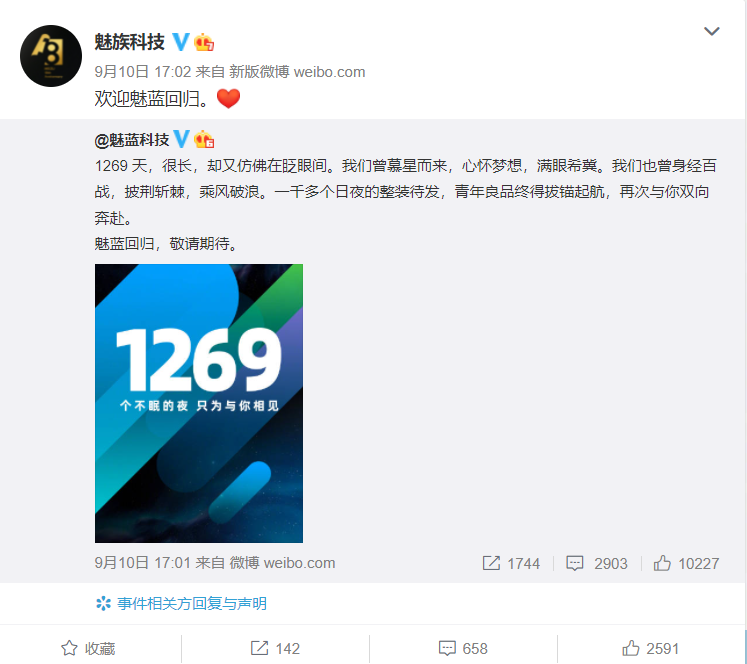 之所以如此,正是魅族在三天前正式官宣,时隔1269 天,魅蓝回归。