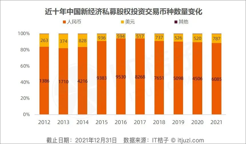 2021 年中国新经济私募股权投资市场上人民币融资事件有 6085 起,与 2020 年相比增长了 35%,占全年融资事件比例为 88.4%;美元融资事件有 787 起,同比增长了 51.3%,占比为 11.4%。近十年来,人民币融资在历年交易事件中占比几乎都在 80% 以上,是中国本土创业企业的主流选择,其特点是融资流程短,周期较快,受政策法规的监管约束较少。