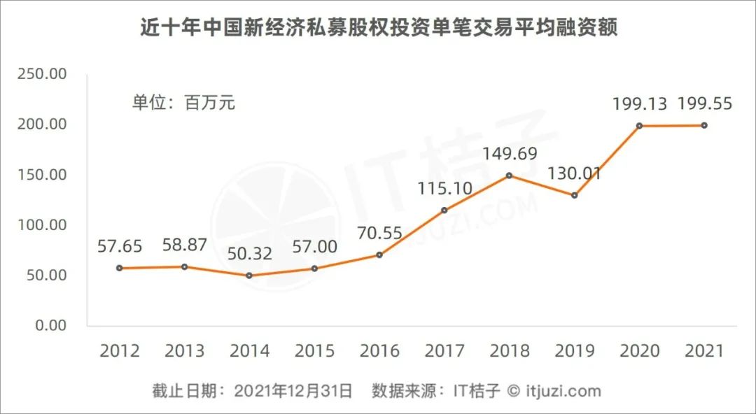 从历年的单笔交易平均融资金额来看,中国新经济私募股权融资的平均交易额呈现不断增加的趋势,尤其是从 2016 年到 2018 年,连续两年以 30% 的斜率增长,到 2019 年则略有下降;之后再次迎来了超 40% 的增长率,到 2021 年,一级市场平均单笔融资额已接近 2 亿元,同比仍有略微的增长,也是近十年来的顶点。