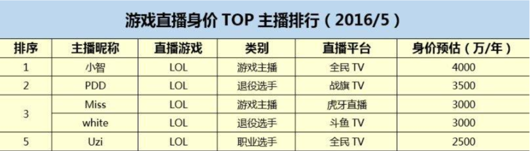 从这份2016年流传出的游戏主播身价来看,当时主播最高身价年薪已经达到4000万。那时主播争夺战正走向激烈,斗鱼和虎牙出手越发强悍,此后直接将份名单上的全民TV和战旗TV熬死。
