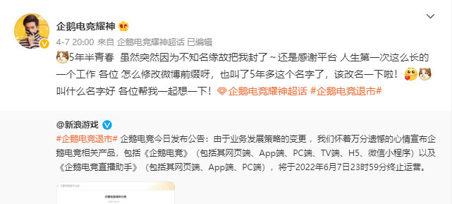 4月7日,企鹅官宣将于6月份关闭当天,耀神发微博:“5年半青春 ,虽然突然因为不知名缘故把我封了~还是感谢平台。”并在评论中表示,能不能给他解封一次,让他5月份来场告别演出。