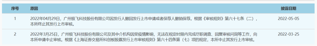 3月25日,极飞科技中止过上市审核,原因是公司及保荐机构因受疫情影响,无法在规定时限内完成尽职调查、回复审核问询等工作。