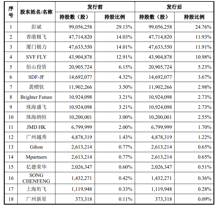 极飞科技成立至今经历了6轮融资,最近的C3轮融资是由高瓴创投追加的超3亿元融资,在极飞科技的C1轮融资中,百度资本、软银愿景基金、创新工场、越秀产业基金等明星机构共同投资12亿元,这也刷新了中国农业科技领域最大笔融资记录。招股书显示,在此次科创板IPO申请前,软银愿景基金的SVF FLY持股12.91%,百度旗下资本佰山投资持有6.15%的股份,高瓴创投管理的JMD HK及珠海纳恒合计持有极飞科技5%股份。