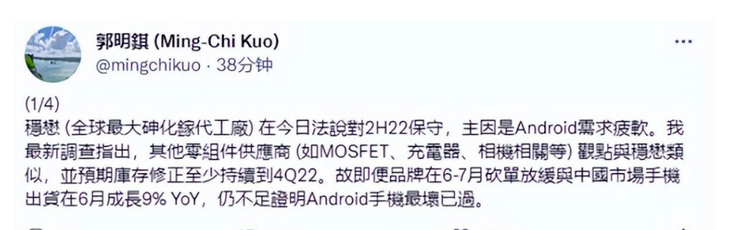 素有苹果爆料王之称的知名分析师郭明錤曾在社交平台上表达自己的态度。他写道:全球最大砷化镓代工厂稳懋对今年第二季度表示保守,主要是因为Android需求疲软。其他零租件供应商(如MOSFET、充电器、相机等)观点与稳懋类似,预期库存修正至少持续到今年第四季度。故即便品牌在6-7月砍单放缓与中国市场手机出货在6月成长9%,仍不足证明Android手机最坏已过。