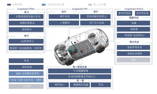 根据零跑提供的一张“自研自制的核心系统及电子部件”版图显示:除了内外饰以及电芯以外,零跑几乎在所有板块都采取了大量自研。其中包括像电机、减速器,连车灯系统都是自研的。