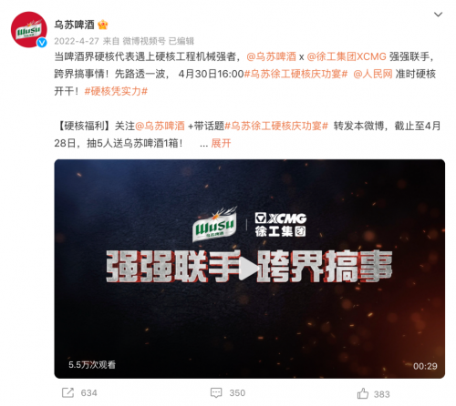 4月30日,乌苏徐工硬核庆功宴正式上线,由人民网、中国新闻网微博同步直播,借助权威媒体矩阵影响力 , 激发多个品牌蓝 V 自发参与转发,#乌苏徐工硬核庆功宴#话题在抖音+微博双平台彻底引爆。上线48小时内,话题阅读量接近2亿,讨论量突破12.8万,大量网友集聚在微博和抖音话题下参与讨论,共同致敬中国劳动者。