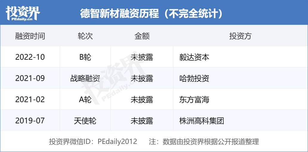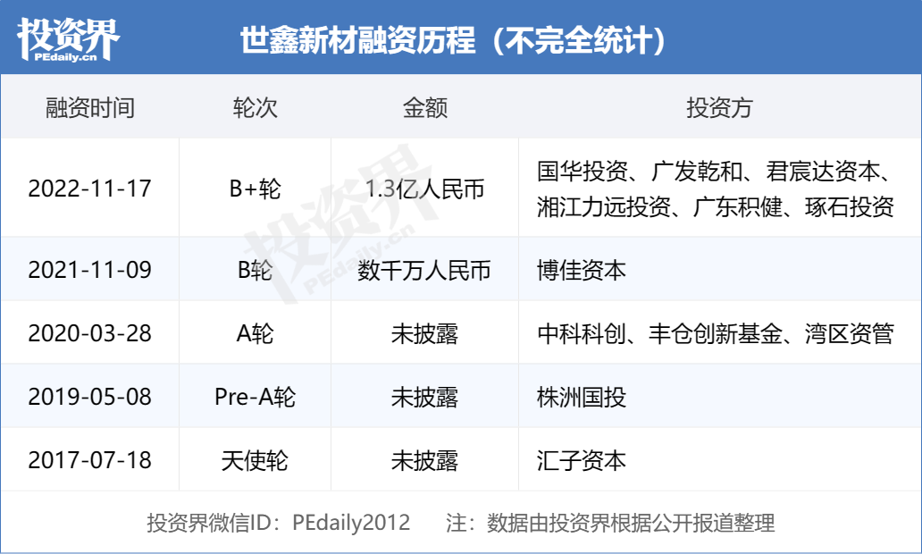 从融资端来看,2022年11月,世鑫新材完成数亿元B+轮融资,由国华投资和广发乾和联合领投。这家为高速列车、轻轨、地铁以及汽车、坦克、航空航天等提供碳陶复合材料的公司成立于2016年,是中南大学科研成果转化的优秀成果,客户涵盖比亚迪、晶科能源、宇泽新能源等头部企业。