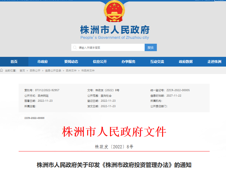 早在2022年12月,为适应新形势,株洲进一步规范更新《株洲市政府投资管理办法》。