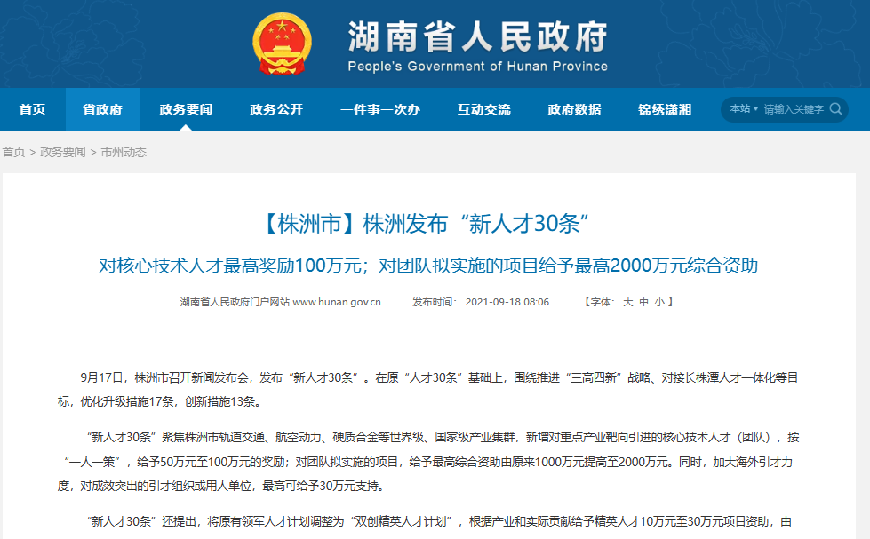 对于人才引进,株洲出台“新人才30条”——,在原“人才30条”基础上,围绕推进“三高四新”战略、对接长株潭人才一体化等目标,优化升级措施17条,创新措施13条。“新人才30条”聚焦株洲市轨道交通、航空动力、硬质合金等世界级、国家级产业集群,新增对重点产业靶向引进的核心技术人才(团队),按“一人一策”,给予50万元至100万元的奖励。