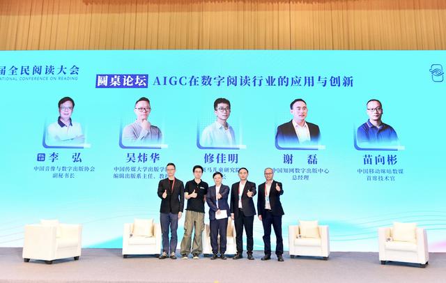 圆桌讨论环节中,围绕“AIGC 在数字阅读行业的应用与创新”热点话题,中国传媒大学出版学院编辑出版系主任、教授吴炜华,斑马儿童研究院院长修佳明,同方知网总经理张宏伟,中国移动咪咕数媒首席技术官苗向彬多位行业代表就展开深入探讨。
