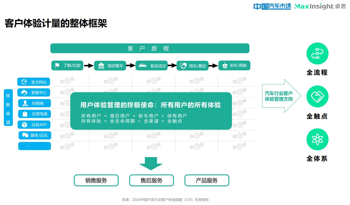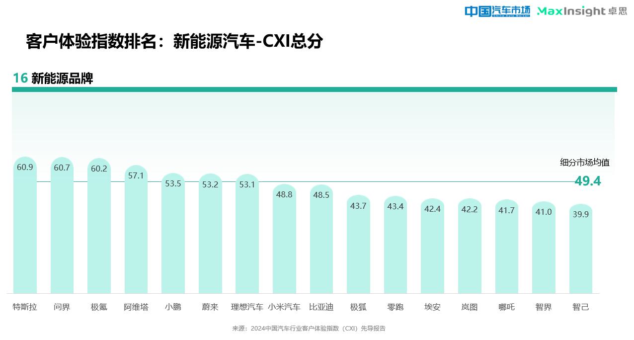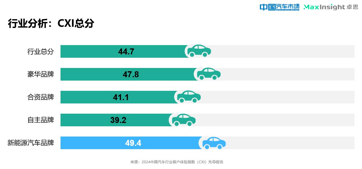 8月31日,由中国电子质量管理协会及中国用户体验联盟指导、北京卓思天成数据咨询股份有限公司与《中国汽车市场》杂志联合发布“2024中国汽车行业客户体验指数(CXI)先导报告”。报告指出,客户的产品和销售服务体验较好,售后服务体验普遍较差;从行业趋势看,新能源汽车品牌的总体CXI已全面领先。