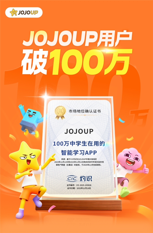 CIC灼识咨询是中国信息协会市场研究业分会(CMRA)会员,作为第三方研究机构,基于丰富的行业洞察、可靠的数据支撑以及全面的行业调研,面向企业提供行业研究相关服务并出具市场地位确认证书,以认证相关企业在特定领域的市场地位。CIC灼识基于对JOJOUP中国大陆地区2023年11月12日—2025年11月12日用户购买数据进行调研及复核,最终认证JOJOUP为“100万中学生在用的智能学习APP”。