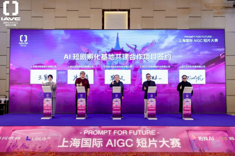 典礼现场,还举行了一场意义非凡的签约仪式。为深入推进大赛成果转化,推动生成式人工智能在短剧及影像内容领域的落地应用,主办方上海市嘉定区南翔镇人民政府旗下蓝天经济城,携手上海艾门韦思网络科技有限公司、上海钛蓝数码技术有限公司、上海仄立文化传媒有限公司以及上海幕间映画娱乐有限公司等核心伙伴,共同签署合作协议,宣布“AI短剧孵化基地”正式启动。