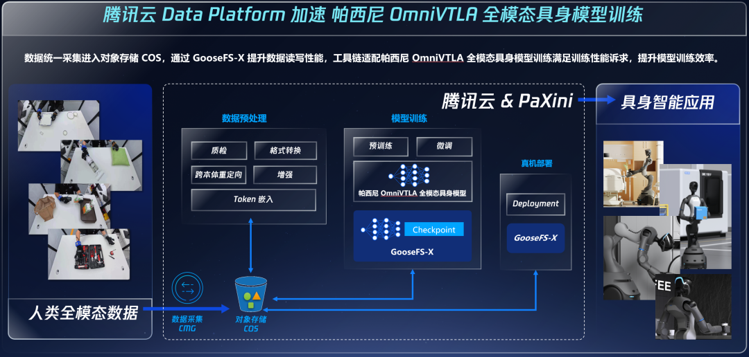 张恒第进一步强调:“机器人与物理世界的每一次交互都产生海量数据。在帕西尼超级数采工厂,单日数据量可达150TB,年数据规模达百PB级别,传统本地存储完全无法承载。”腾讯云存储Data Platform所支撑的采集数据上传、存储、训练环节,便成为海量全模态具身数据高效推进产业跃迁的关键。