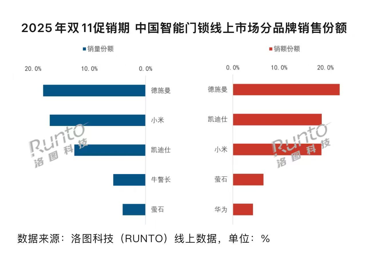 双11大促正式落幕,各大行业权威机构陆续发布最终真实数据。近日,奥维云网、洛图科技两大权威机构发布了智能锁行业的双11最终报告,行业领军品牌德施曼在两份报告中均拿下了线上市场销额&销量双第一,2000元以上高端市场销额&销量双第一的成绩,以远超对手的成绩,领跑行业。