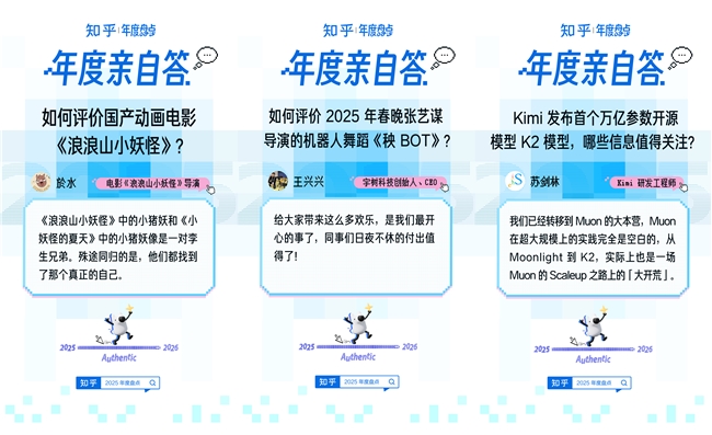 在 AI 席卷的年代,人类经验依旧构成世界的核心参考。除6位领答人分享勾勒出他们的2025年真实图景之外,更多的知乎答主也加入这场问答之中,不同领域、不同人生的个体在这里相遇共鸣。同“真实”之问同步开启的是,宇树科技创始人王兴兴、《浪浪山小妖怪》导演於水、KIMI研发工程师苏剑林等十位知乎答主过去一年,凭借其真诚的表达、深刻的思考被评定为“年度亲自答”,这些声音成为2025年社区真实表达的重要注脚。