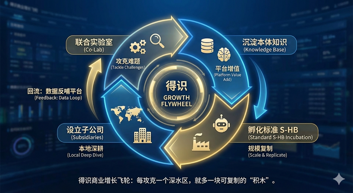 通过联合实验室攻克一个复杂场景,验证可行性;整理沉淀为平台层的本体知识与交付方法论;演化出可复制的标准化 S-HB,按席位制在更多区域或品牌落地;在关键区域与伙伴共建子公司,实现深度的本地化渗透;反过来,这些实战又持续向平台回流新的数据与记忆。