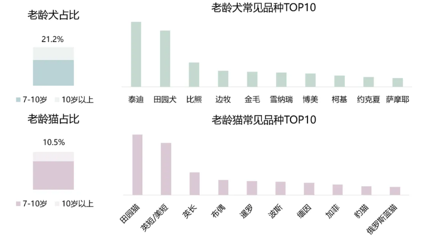 深入观察这近3000万的“银发族”内部,其品种分布也折射出时代的印记。亚宠研究院数据表示,在老龄犬中,泰迪、贵宾等小型犬以及忠诚的中华田园犬占据了显著比例;而在老龄猫中,常见的则是中华田园猫与英国短毛猫、美国短毛猫等品种。
