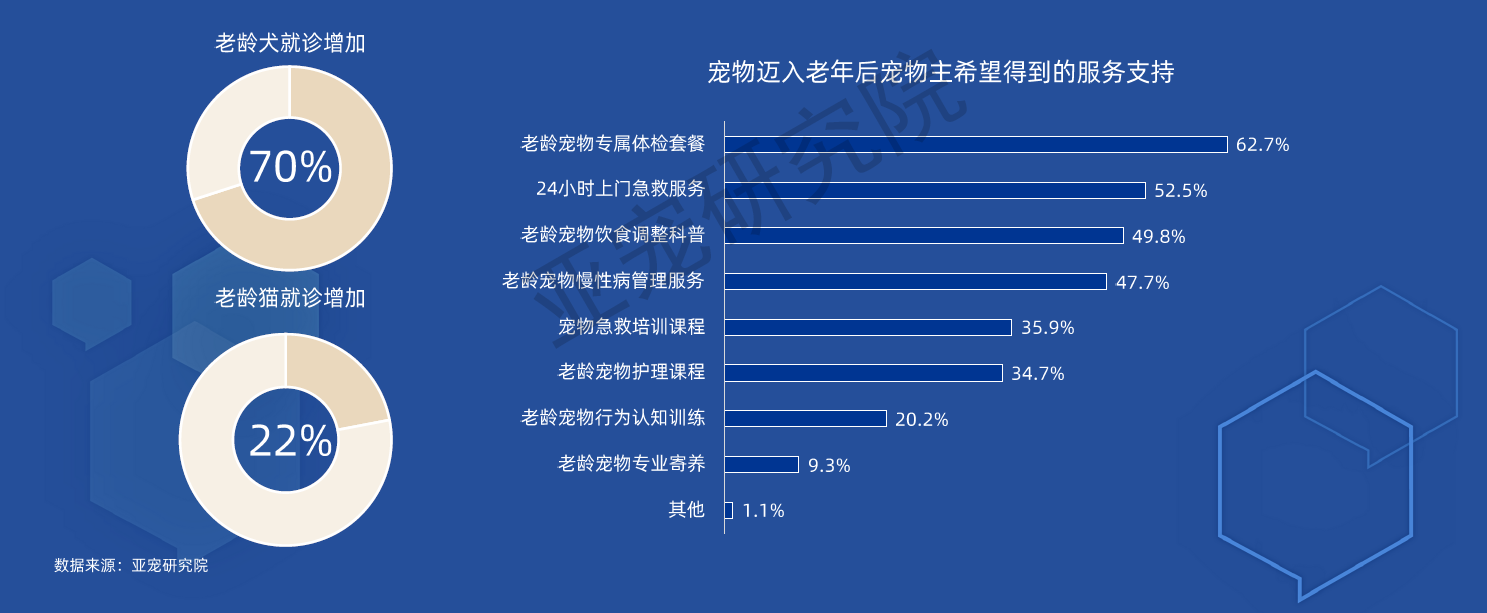 与之形成鲜明对比的是持续旺盛的市场需求。据亚宠研究院报告,有70%的受访宠物医院表示近一年老龄犬就诊数量增加,22%的医院表示老龄猫就诊数量增加。